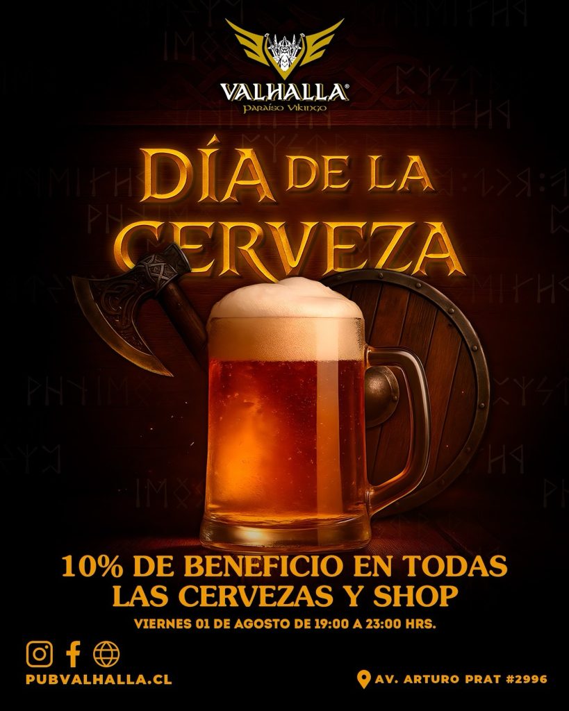 🔥 Todas las cervezas y shop con 10% de beneficio 🍻🕖 Viernes 01 de agosto, de 19:00 a 23:00 hrs ⏳ 🍖🍻 Espuma, cuernos y buena compañía…¡como un verdadero vikingo en el Valhalla! 🛡️🍂 📍 Av. Arturo Prat #2996 #DíaDeLaCerveza #ValhallaParaisoVikingo #CervezaVikinga #PromoValhalla #ViernesDeCerveza
