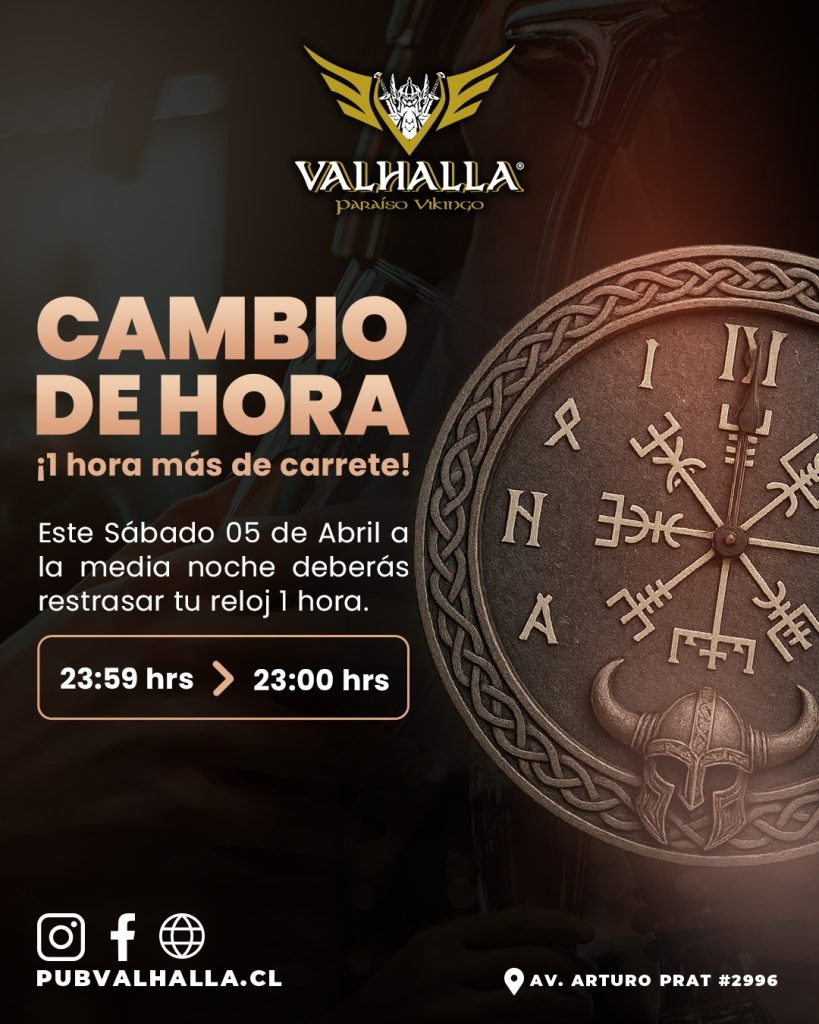 Este sábado 05 de abril, a la medianoche 🕛, retrasamos la hora 1 hora ⏰. ¡A las 23:59 cambia a 23:00! Y lo mejor de todo: ¡tendremos una hora más de carrete para seguir la fiesta! 🍻🎉 ¡Nos vemos para seguir la celebración con toda la energía! ⚔️🔥 #ParaísoVikingo#CarreteSinFin#AjusteDeHora#FiestaVikinga